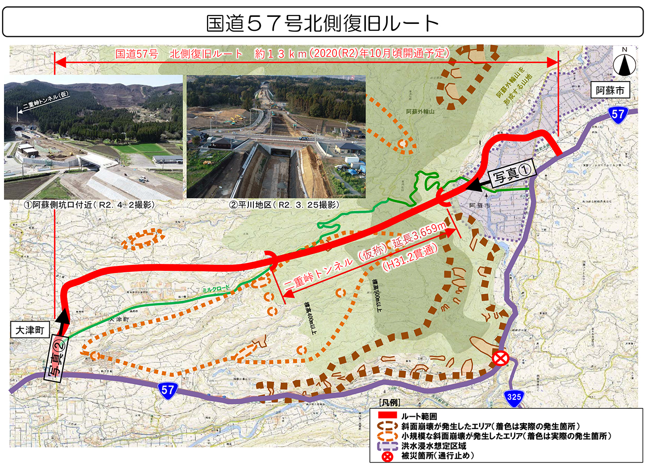 国土交通省 国道57号北側復旧ルートは2020年10月頃、国道325号阿蘇大橋ルートは2021年3月頃に開通見込み