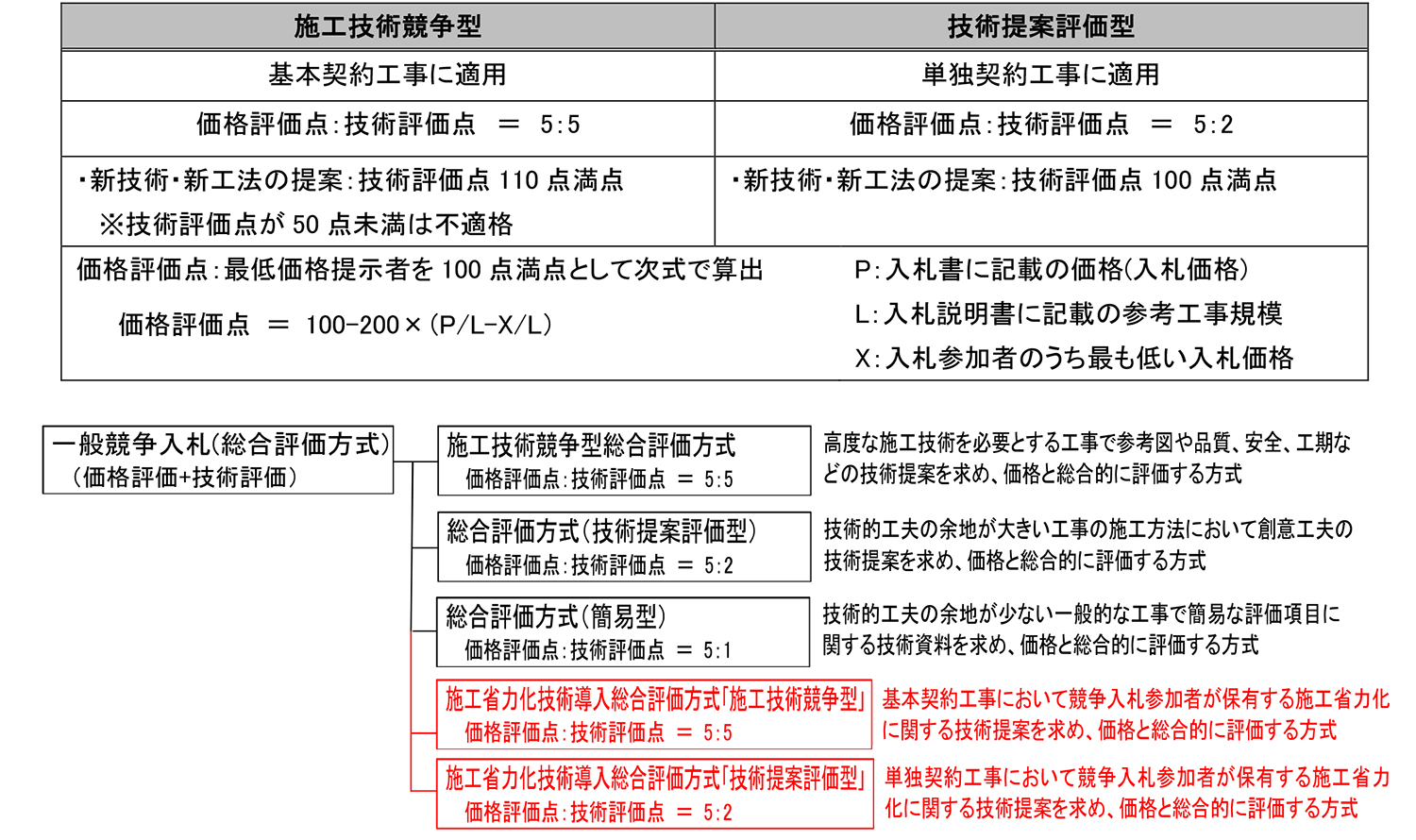 今回試行導入する施工省力化技術導入総合評価方式は、基本契約の下で複数の個別工事契約を紐付けて発注する「基本契約工事」では施工技術競争型、基本契約によらず一つの工事契約だけで完結する「単独契約工事」では技術提案評価型をそれぞれ実施する(詳細は下表参照)。