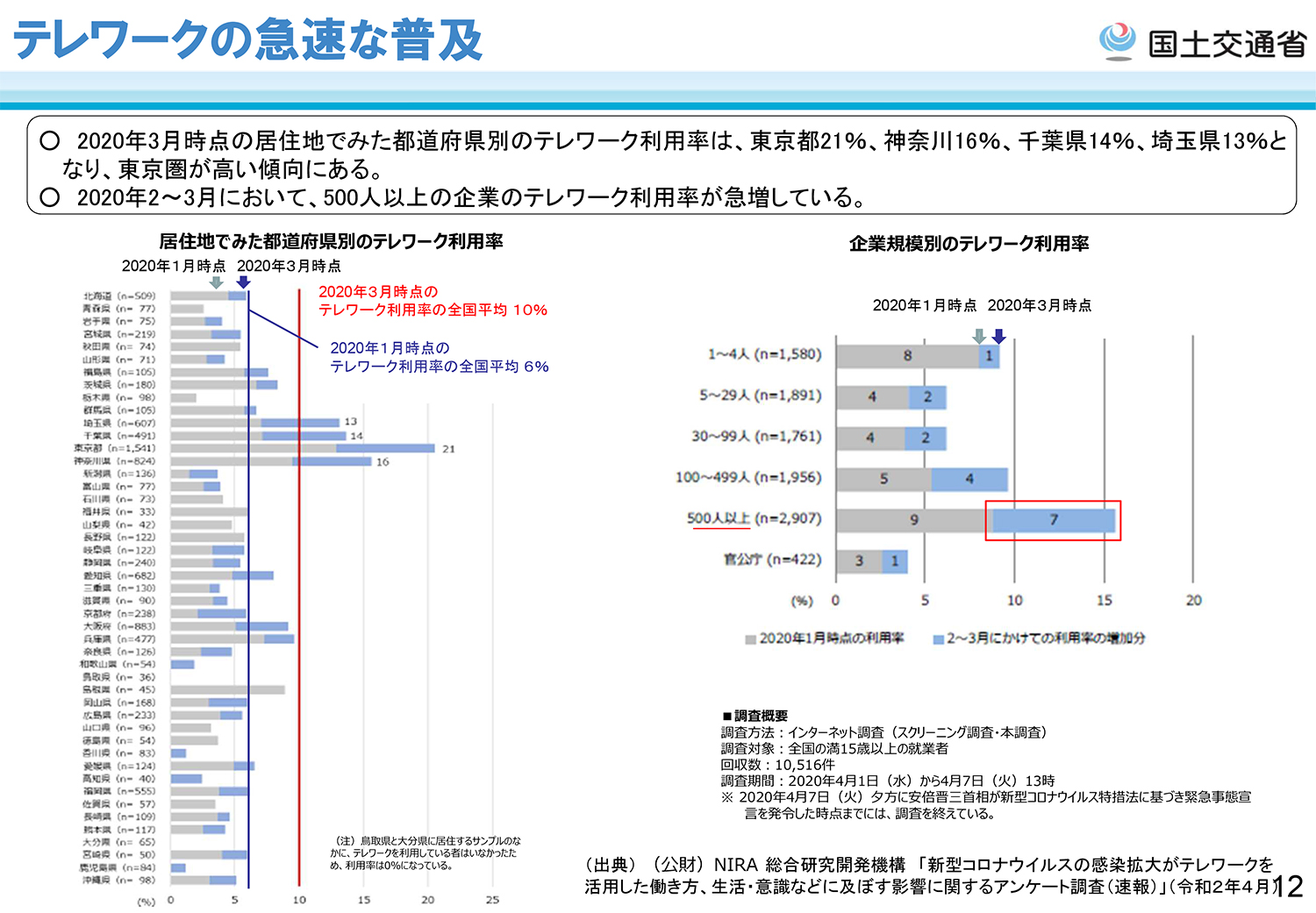 同感染症拡大によりテレワークの利用が急増している(※下記資料)ことを受けて、各委員は肯定的に捉えたうえで、情報基盤の整備をさらに進めるとともに、そのインフラを扱える人材を育てる必要があるなどの意見が出された。また、東京とその他の地域では同感染症に対して温度差があり、人口および機能の一極集中の問題性を改めて共有できたので、分散ネットワーク型の国土に変えていくことについても議論された。そのインフラ整備を国と地方自治体のどちらが主導して行うのかについても検討していく必要があるとの考えも示された。