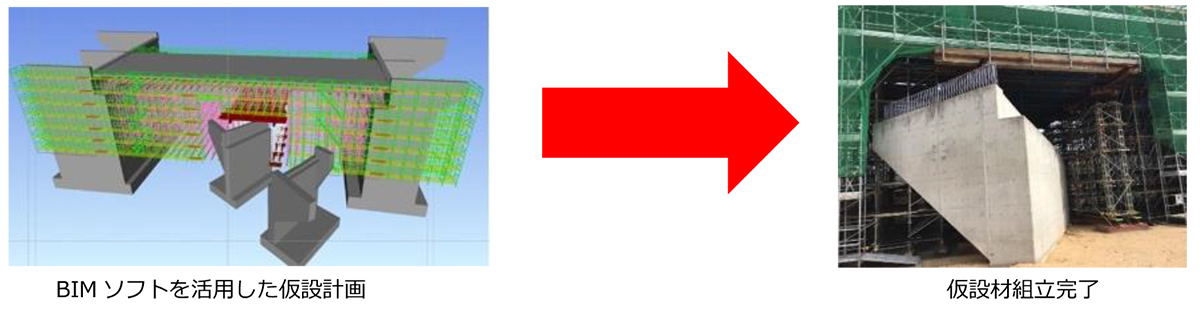 BIMサービスを導入することにより、躯体との干渉などの不具合の早期発見や仮設計画をスムーズに進めることができる。さらに、「Takamiyaコマンド」という独自のカスタマイズ機能により、仮設工の3D設計モデルの中から範囲を選択するだけで、その範囲内の仮設機材の数量算出が可能となっている。同機能により、事務職員でも簡単なレクチャーで数量算出ができるため、社内業務コストの10%削減を実現する。