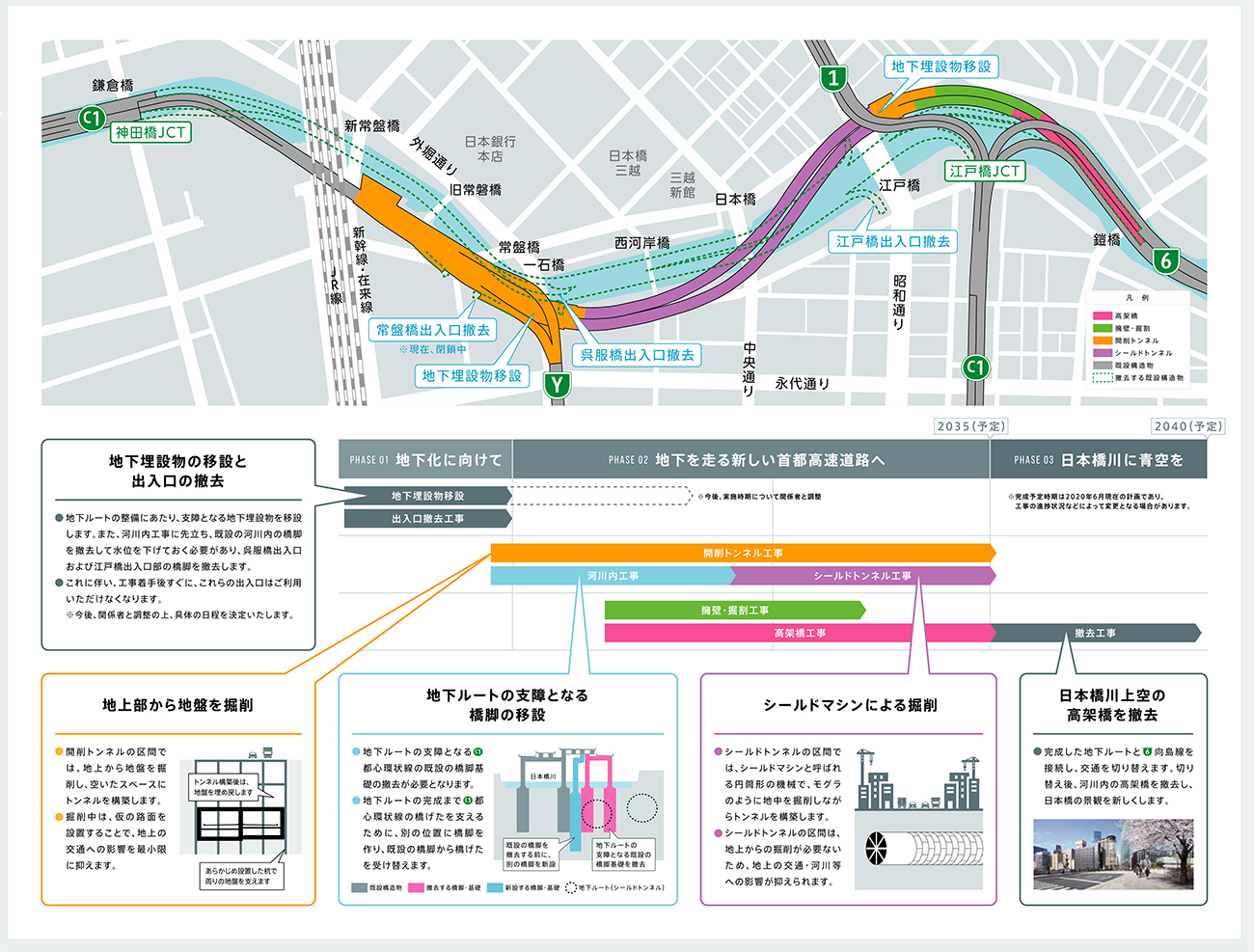 7月3日にはトンネル工事に支障となる江戸橋・呉服橋出入口の撤去工事の入札公告を行い、契約手続きを開始した。今秋からは地下埋設物の移設工事などに着手する予定だ。出入口の撤去と地下埋設物移設には4~5年を見込んでいる。
