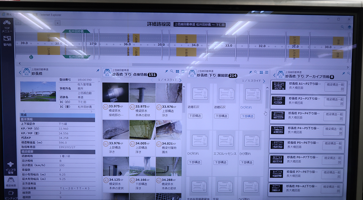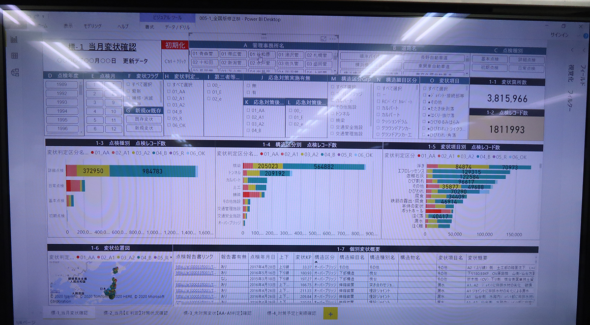 具体的なツールとしては、複数のデータベースの情報を一元的に検索・表示するUIツール、点検データを可視化・分析するBIツール、高速道路の現地状況をPC画面で把握でき、画像内で距離計測が可能な全周囲道路映像システムなどが導入された。