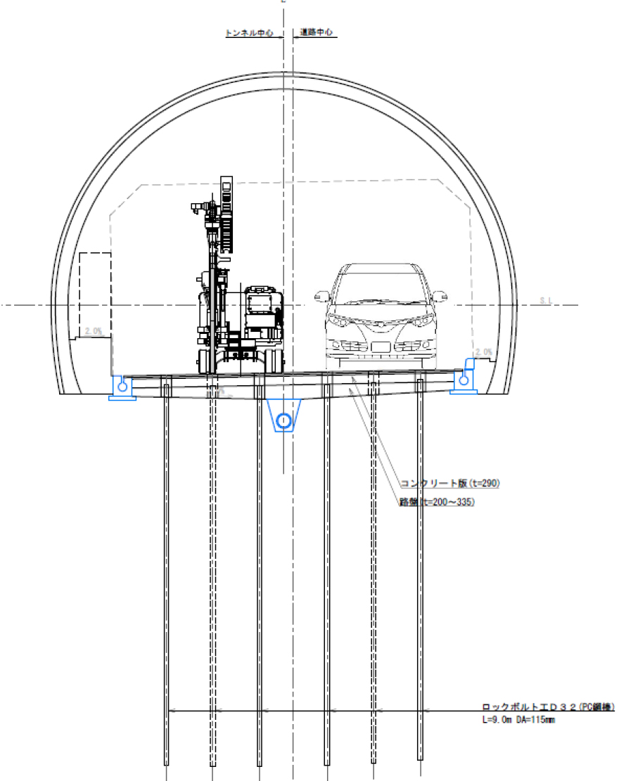 インバートコンクリート未設置のトンネルでは、地山の長期的な風化変状により路盤面が隆起する「盤膨れ」が発生し、その対策が必要となる。対策工には、インバート設置工およびロックボルトや鋼管打設工があるが、インバート設置工では通行止めを含む長期間の道路規制や費用がかさむ課題があった。一方、ロックボルトや鋼管打設工は短期間で施工できるが、トンネル内での粉塵発生が課題となっていた。今回の無粉塵化により、その課題を解決し、供用下の通行車両に影響を与えることなく施工ができるようになった。