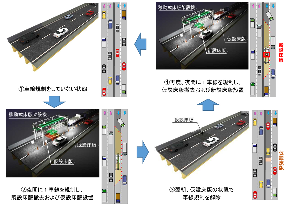 半断面専用の移動式床版架設機「ハイウェイストライダー」や、舗装と防護柵を一体化させた仮設床版、大林組が開発した超高強度繊維補強コンクリート(UFC)「スリムクリート」を使用したプレキャスト板「スリムNEOプレート」などを新たに開発。それらを用いることで床版取替工の施工ステップを分割して、夜間のみの施工を実現させた。