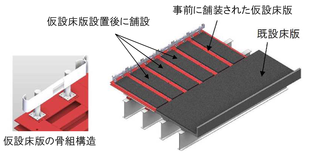 同工法の施工ステップは、「既設床版切断~床版架設機搬入~既設床版撤去~上フランジケレン・本設スタッド溶接~仮設床版設置~仮鋪装・交通開放」と「仮鋪装撤去~仮設床版撤去~新設床版設置~スリムNEOプレート設置~本鋪装・交通開放~床版接合部(スリムファスナー)へのスリムクリート充填」の2ステップに分かれている。最初のステップ(1日目)を行った翌日以降の夜間に次のステップ(2日目)を行うのが標準であるが、今回は昼夜連続で作業を行っているので、原則、昼間に仮設床版の撤去まで行い、夜間に架設機を搬入して新設床版架設以降の工程を行っている。