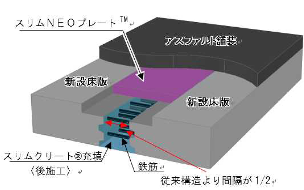 新設床版設置後は、床版接合部上部に「スリムNEOプレート」(厚さ350mm)を設置する。高強度のUFCであるために、鋪装後はすぐに鋪装工に移れるのが特徴だ。床版の接合は「スリムファスナー」を用いて、後日、スリムクリートを床版下面から充填していく。橋軸方向の接合構造(縦目地)についても、橋軸直角方向と同様で、スリムNEOプレートを設置して、接合はスリムファスナーで行う。