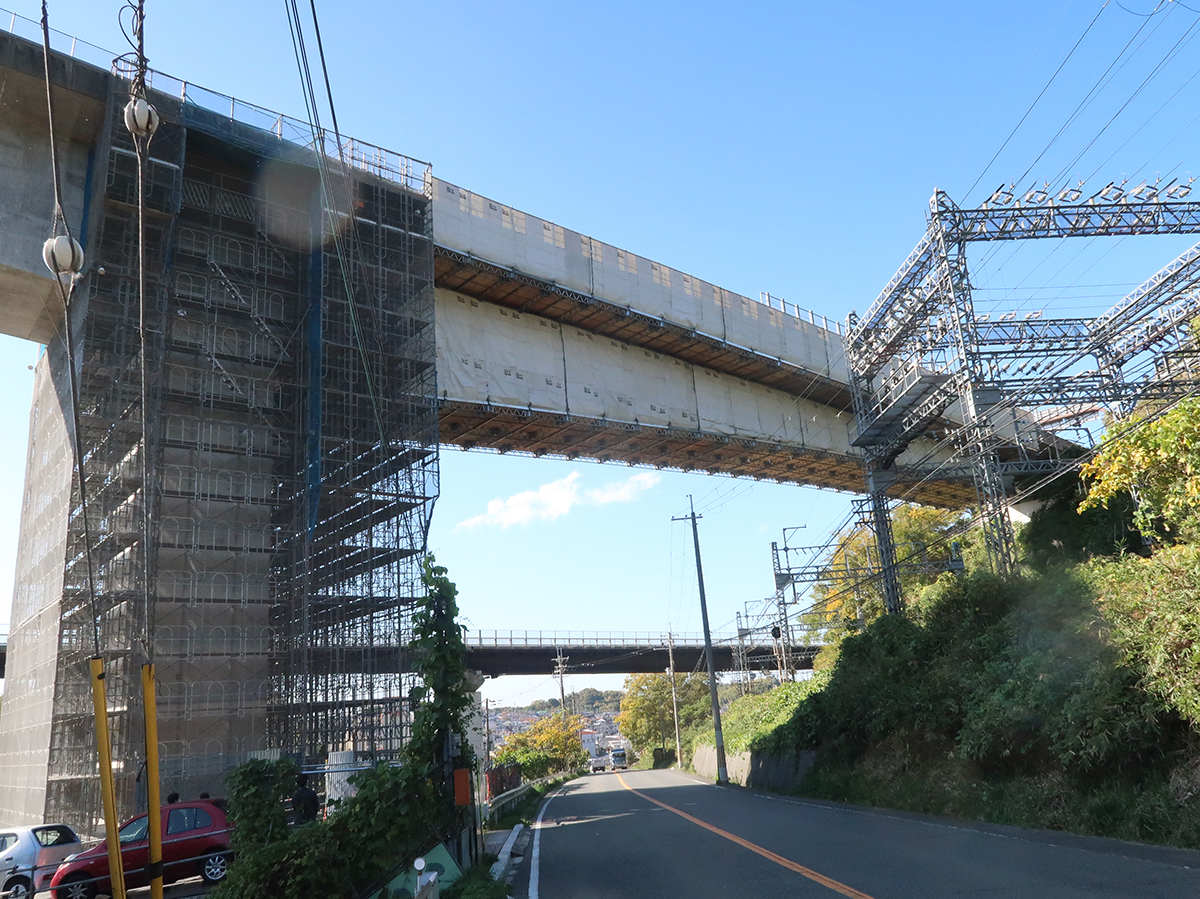 同橋では、クイックデッキをA1橋台~P1橋脚間の近鉄線と府道703号上に延長約62mにわたり、箱桁部と張出床版部の上下2段に設置した。施工は、鉄道および道路上であることから夜間作業となり、とくに全延長の約4割弱を占める休電作業区間では午前1時30分から同4時までのき電停止時間内に準備と片付けを含めて作業を行わなければならなかった。そのため、施工性に優れ、先行床施工式でなくては設置ができなかったと言える。施工は、荷揚げや運搬を含め平均8人の作業員で、1夜間2スパン(1スパン2,496mm)の設置を行い、約3カ月で完了している。