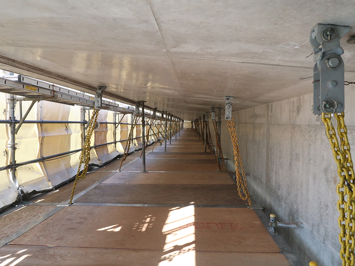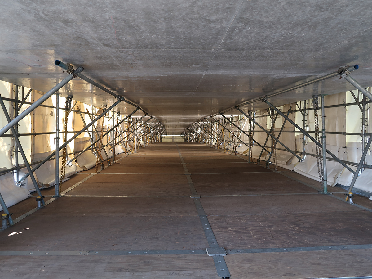 箱桁部の足場。1,850mmのクリアランスを確保し、段差もなく広い作業空間を実現