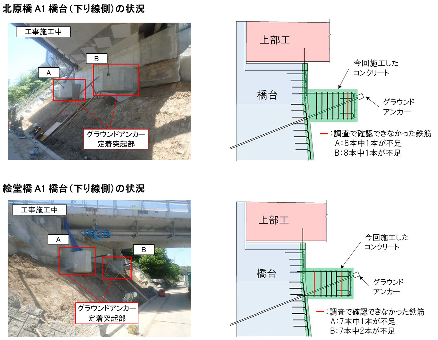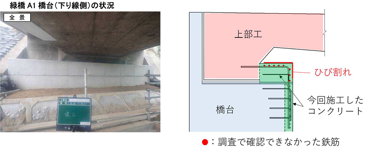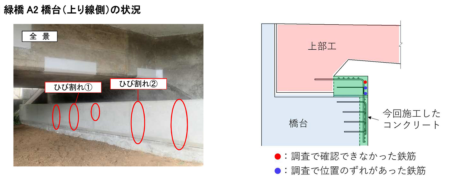 まず緑橋のA1橋台(下り線側)のコンクリートでひび割れが発見され、調査した結果、鉄筋の不足が判明した。その後、同橋のA2橋台(上り線側)、北原橋のA1橋台(下り線側)、絵堂橋のA1橋台(下り線側)においても鉄筋の不足が判明した。