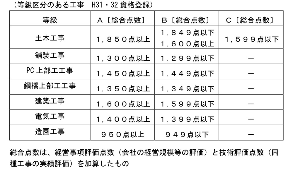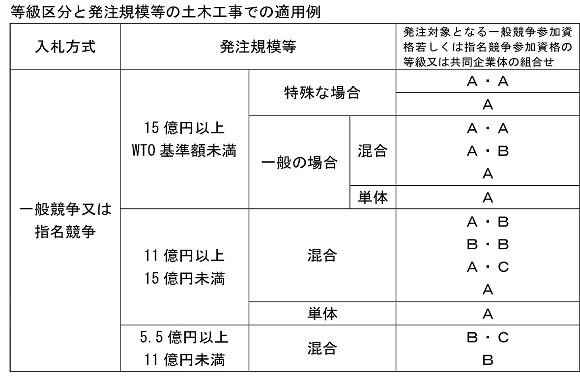 調査によって明らかになった事実や課題から、NEXCO中日本は当面の再発防止策をまとめた。まず契約の適正性については、入札不調時の再発注においても可能な限り発注単位、工程の見直しを行い、競争参加資格要件の緩和は最後に行うこととした。今次の案件課題内容に鑑みて、土木補修工事に等級区分(下表)を設定し、発注規模、技術的難易度に応じた適切な発注を実施すること、地域要件の設定に関する基準を明確化し、統一的な運用を図ることなども示された。