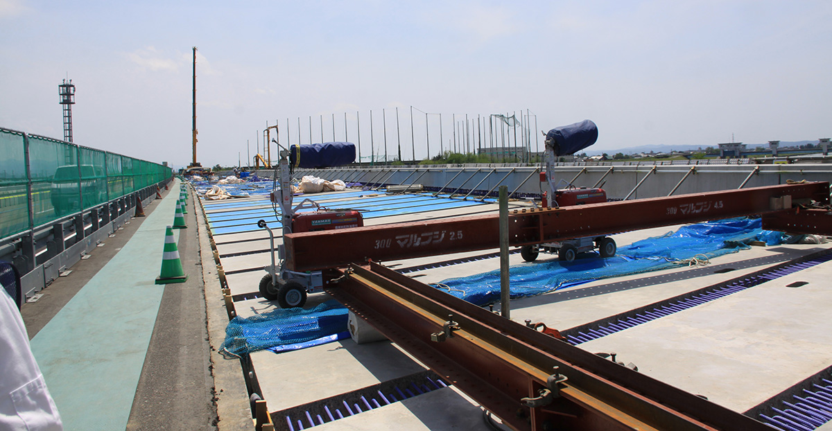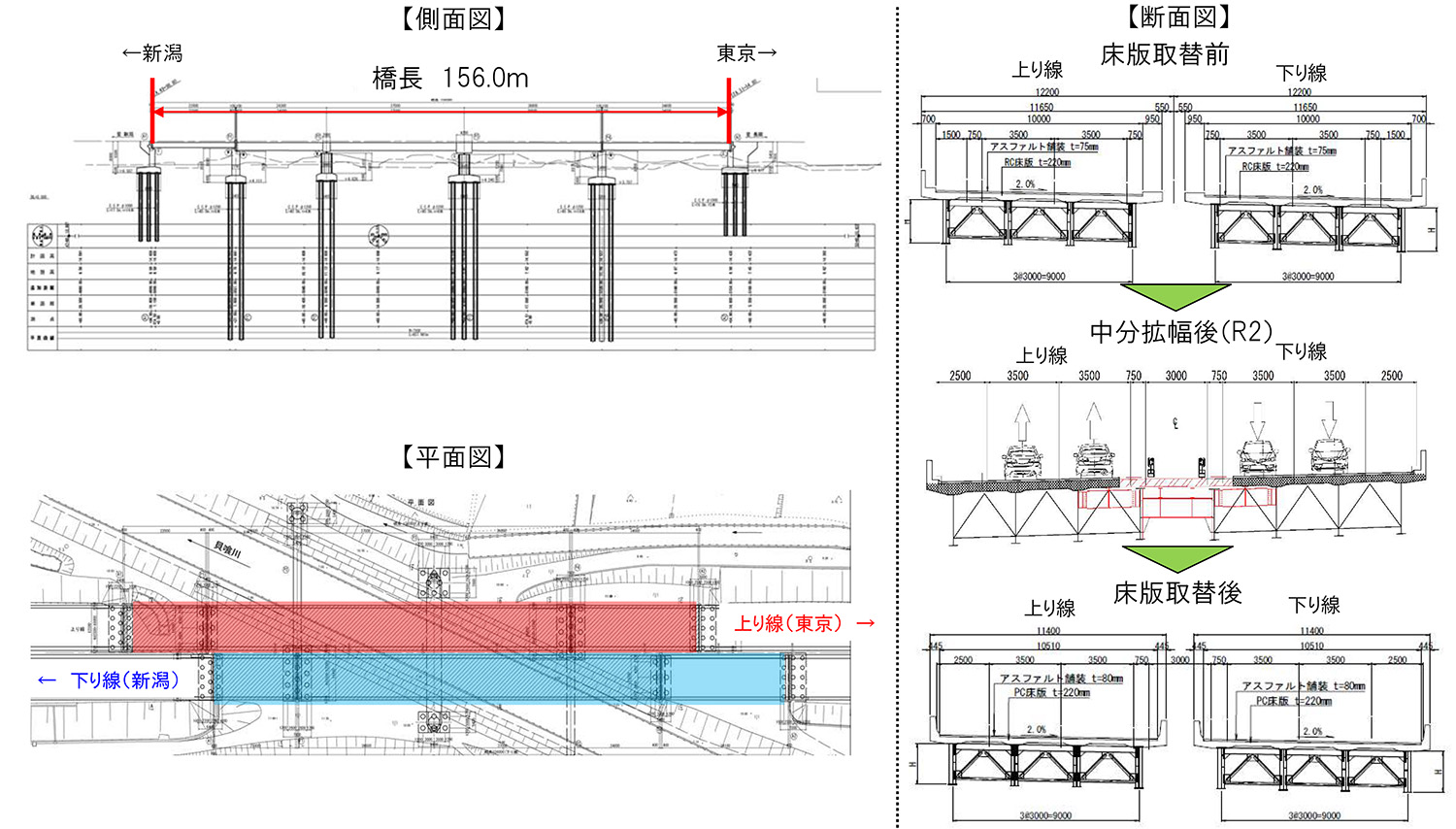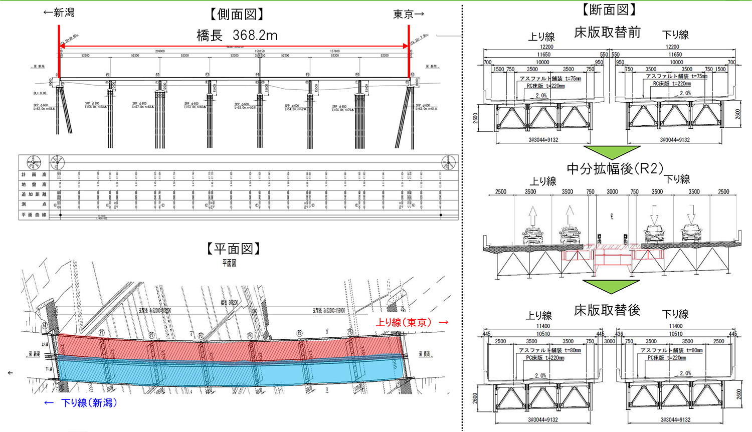 現在は両橋とも下り線側の既設床版撤去と新設プレキャストPC床版の架設を行っている。壁高欄も施工日数の短縮を図るためプレキャストRC壁高欄を用いている。
