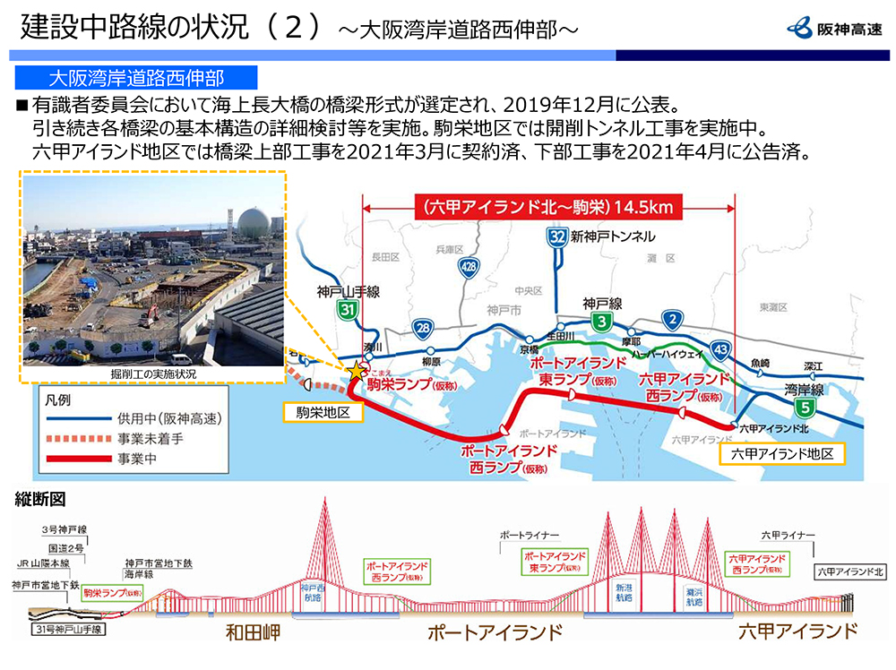 大阪湾岸道路西伸部では海上長大橋の橋梁形式が決定し、現在は各橋梁の基本構造の詳細検討などを進めている。さらに当該工事のなかで六甲アイランド地区は、橋梁上部工事を今年3月に契約し、4月には下部工事を公告している。