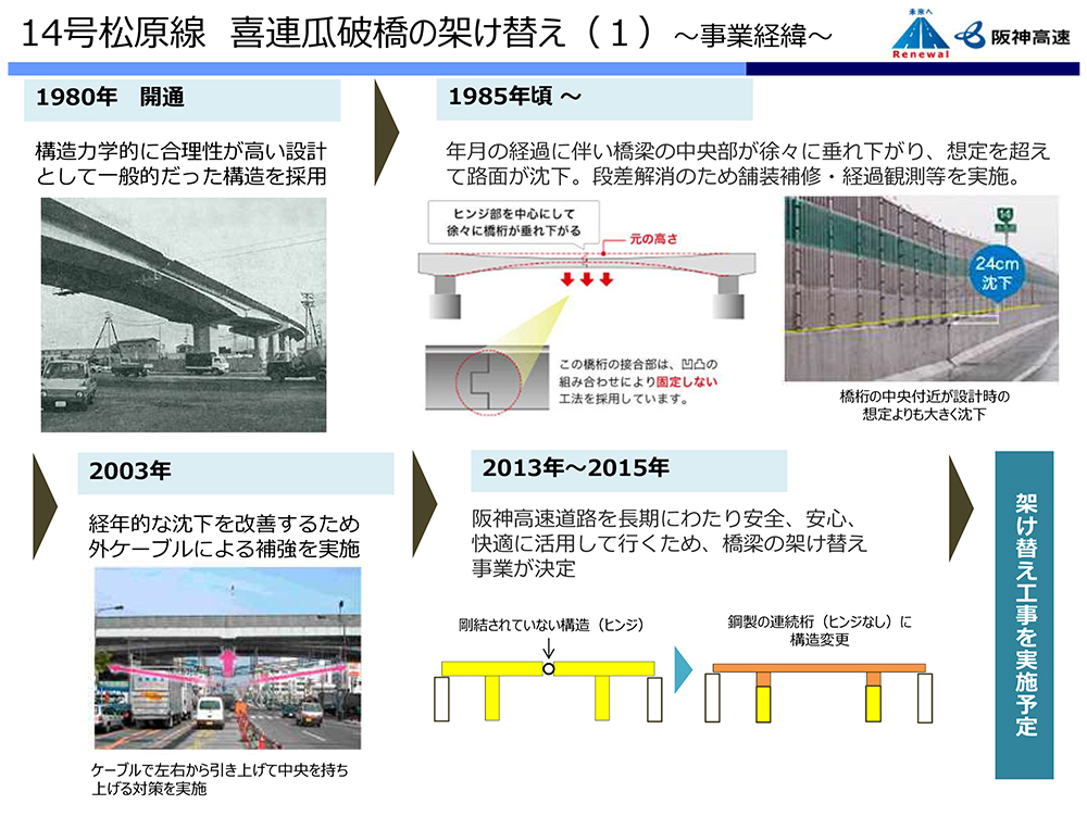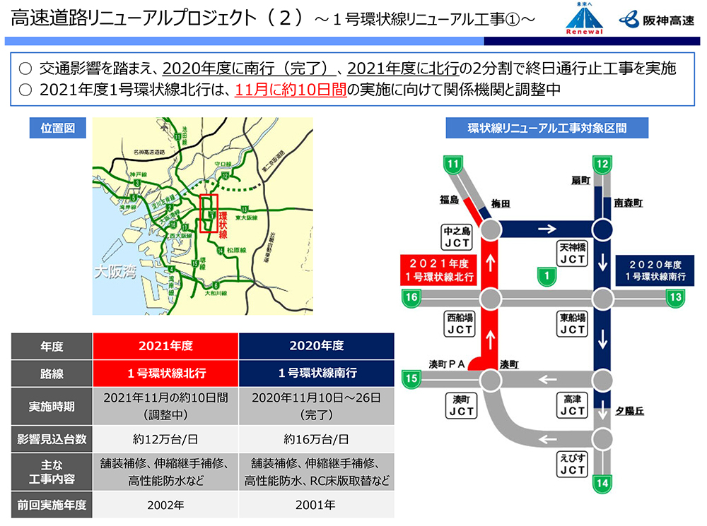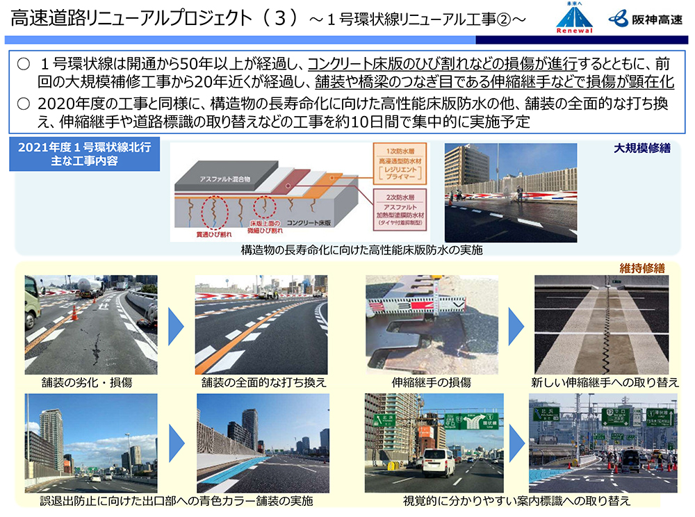 リニューアル工事では、1号環状線北行の舗装補修・伸縮継手補修・高性能防水などを11月に実施する、床版取替工事は予定していない。
