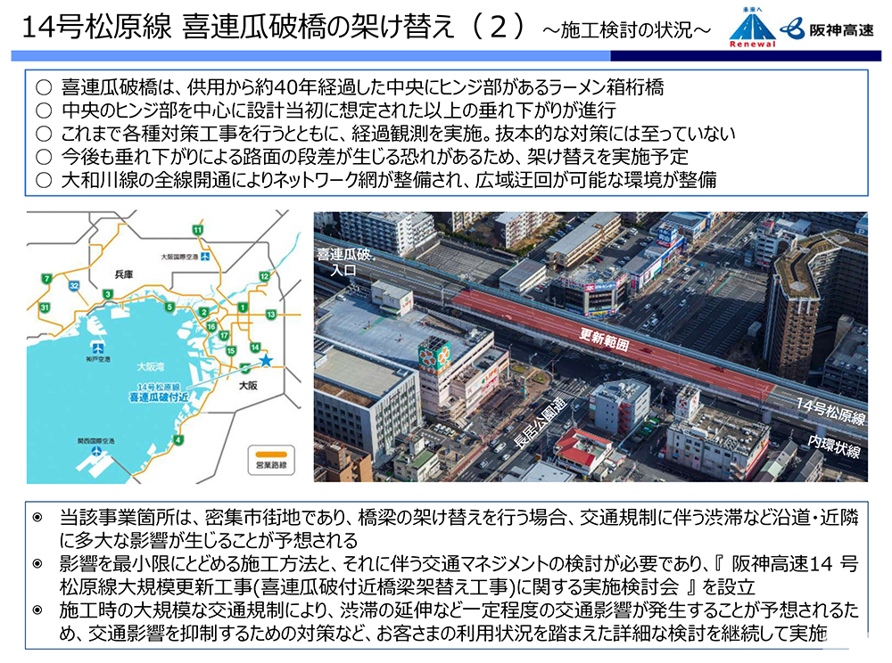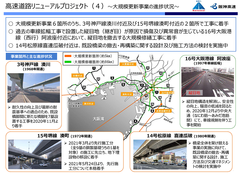 3号神戸線湊川付近および15号堺線湊町付近の2か所で工事に着手。16号大阪港線(西行)阿波座付近では縦目地を撤去する大規模修繕工事に着手している。14号松原線喜連瓜破付近では既設橋梁の撤去・再構築に関する設計・施工方法を検討している。