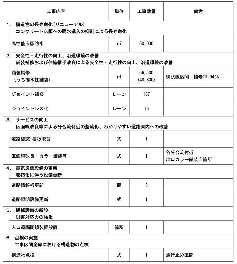 工事は高性能床版防水工事(50,000㎡)、舗装補修(56,500㎡)、鋼製伸縮継手の取替えのほか、標識や看板の取替え、電気通信設備の更新などを行う。対象となる工事区間は1日利用台数が約12万台で、工事中は終日通行止めとなるため、同社では時間帯別渋滞予測マップやう回ルート検索システムなどを提供する。