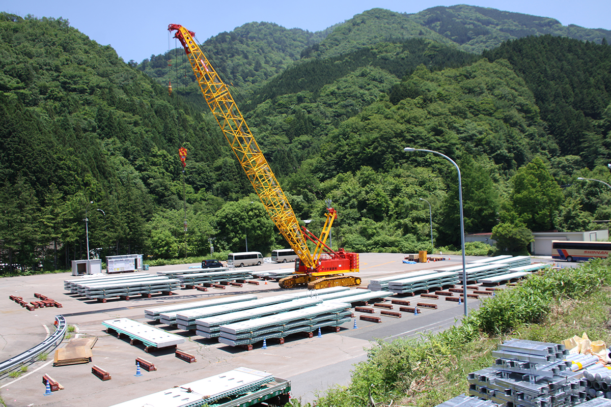 現場での床版取替~舗装までの工期は7月4日までの49日間。その間、同橋前後の約3.5kmは下り線を規制し、上り線を対面通行にする規制を実施している。施工は大林組・JFEエンジニアリングJV。(井手迫瑞樹、詳細は7月上旬に『現場を巡る』コーナーで掲載します。)