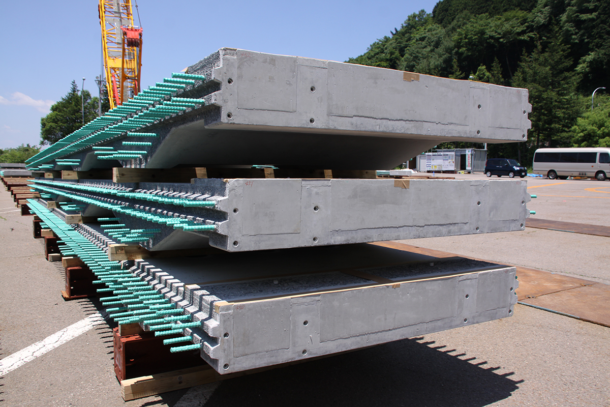 床版仮置きヤード/プレキャストPC床版継ぎ手部に凹凸があることが分かる