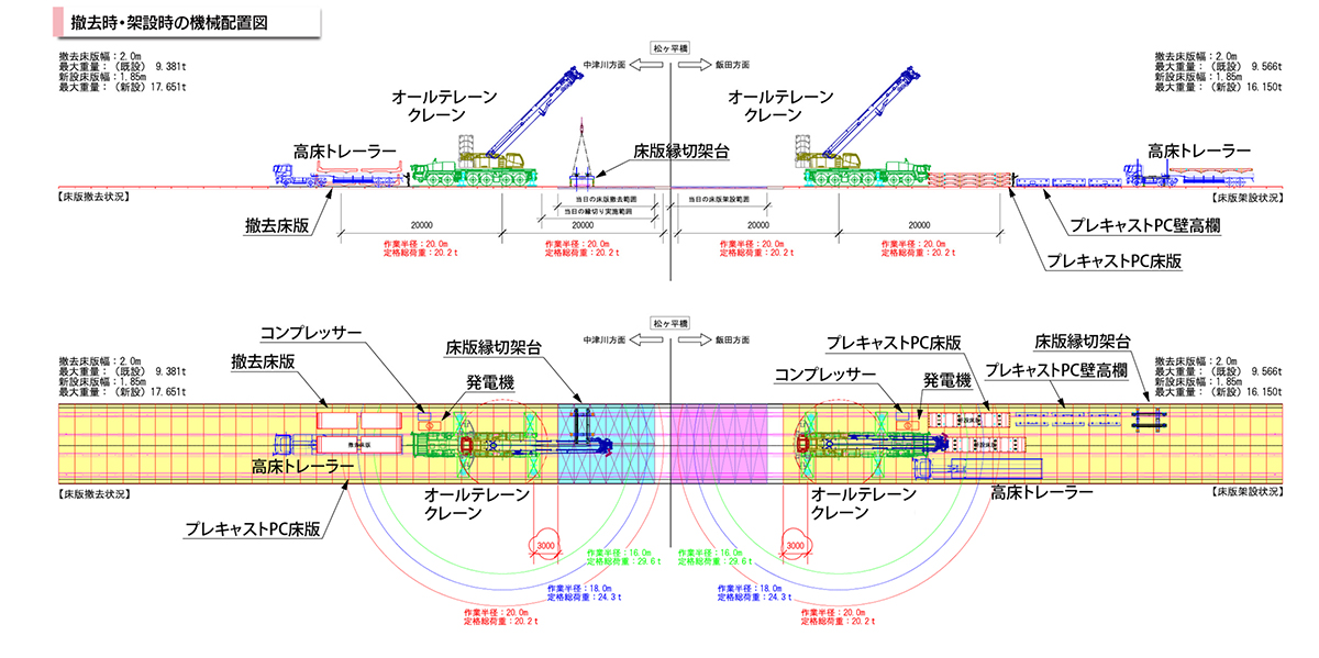 施工は橋梁中央部から両橋台部へ2班に分かれて施工している。1班当たり1日12枚の既設床版を撤去、6枚(12m分)の新設床版を架設しており、わずか4日間で100m近い取替を実施している。新設プレキャストPCパネルの総数は147枚だが、取材当日までに約6割に当たる87枚の架設が完了していた。