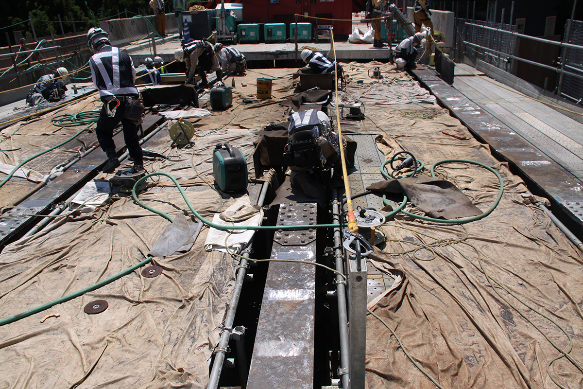 作業サイクルは午前中に既設床版を撤去し、昼間に新設プレキャストPCパネルの準備工(既設ジベルの撤去や上フランジ上面のケレンなど新設床版受け入れの準備)を施工、次いで夜間に床版取替工を実施するという工程を繰り返した。足場は通常の2段足場ではなく、作業効率を考慮して、床版撤去後に上段足場(写真)を作り、桁上面のケレンなどの作業をしやすくしている。既設床版の撤去は従来壁高欄を切断後、床版を2分割して撤去していたが、この現場では吊り方を工夫することで、壁高欄と床版の半分、床版の残り半分の2分割(2m×5m、最大重量9.566t)で撤去しており手間を大幅に省いた。その後、新設プレキャストPCパネルを設置するが、これは全幅(1.85×10.14m、最大重量16.15t)で設置している。