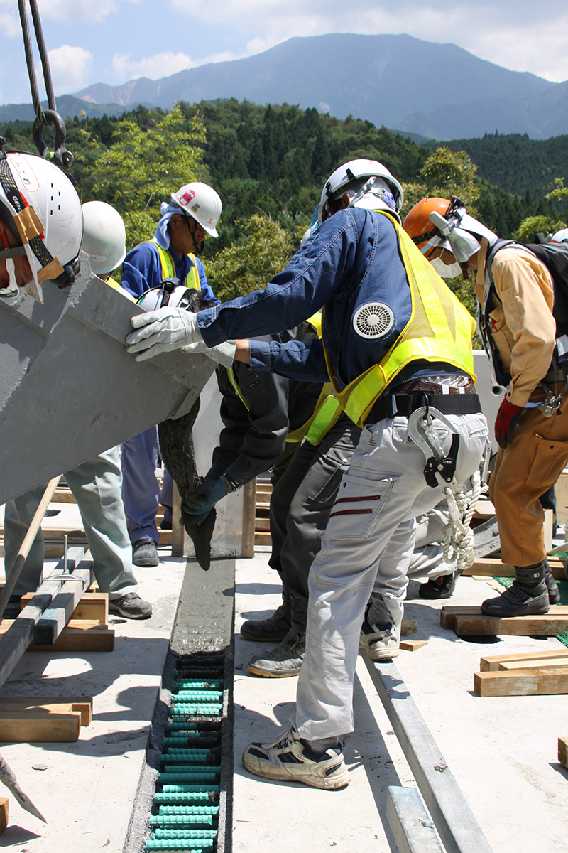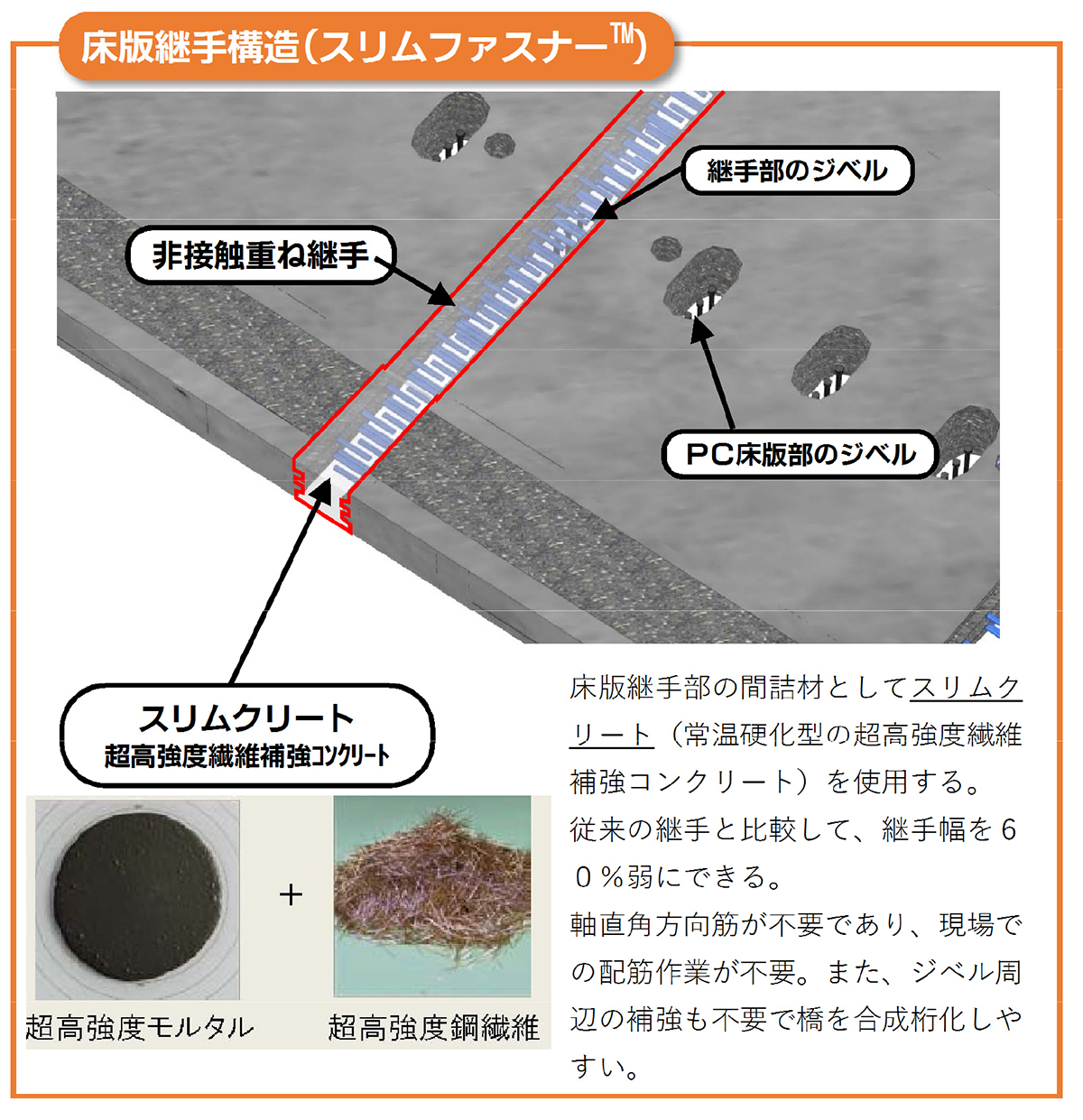 架設後は継手部に間詰コンクリートを打設する。継手部には大林組が開発したスリムファスナーという技術が使われている。間詰コンクリートにスリムクリートという鋼繊維を2vol.%混入した180N/㎟に達する超高強度コンクリートを使うことによって、継手部の鉄筋は橋軸方向の非接触の重ね継手だけで良くなり、鉄筋どうしの接合や橋軸直角方向の配筋も不要とし、かつ継ぎ手長さは210mmと従来よりも各段に短くなっている。スリムクリートは緻密性が高いコンクリートではあるが、100年間の長期耐久性を企図し、床版全面および継手部にはエポキシ樹脂塗装鉄器を使用している。壁高欄もEMC式壁高欄という新しいプレキャスト壁高欄を用いた。同製品は大林組と首都高速、プレキャストガードフェンス協会が開発したもので、高欄と床版、高欄間の連結をアンカーボルトにより接合する簡易な施工であるため、ここでも工期短縮が可能だ。