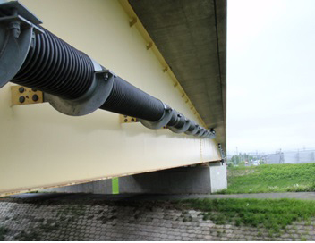 橋梁の長寿命化は、変状の早期発見・早期補修をすべきである。変状を早期に発見するため、検査路は安全に点検ができる状態であることばかりでなく、点検対象に対し適切に点検できる位置に設置されていることが重要である。しかしながら、図-16に示すように伸縮装置等からの漏水により検査路が腐食し穴があく等、安全に点検できない場合がある。また、桁高が高い際には、伸縮装置等を十分に点検できない状況も見受けられる。そこで北海道支社では、腐食しないFRP製の検査路の試行を行っている。更に、桁高が高く、伸縮装置等を十分に点検できない箇所には、中段検査路設置の試行も行っている。図-17にFRP製の中段検査路の写真を示す。
