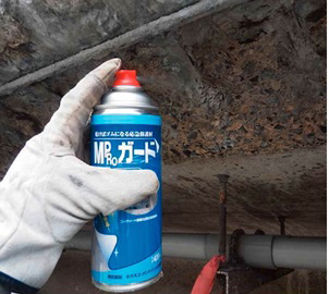 劣化損傷した橋梁を発見した際に、従来であれば、落下等の危険がある部位をたたき落とし、鉄筋が露出している場合には、常温亜鉛メッキ等で防錆していたが、コンクリート剥落面は無処理であった。この後、補修するまでに数年間放置される場合もあり、更に劣化が進行してしまう可能性がある。そこで、北海道支社では、NEXCO東日本グループ会社が開発した「Mproガード」を損傷箇所に塗布する試行を実施している。Mproガードは、図-18に示すように合成樹脂塗料(無色透明)を当該箇所にスプレーで塗布することで、合成ゴム状皮膜を形成させ、水や空気を遮断する。このため、凍結防止剤等の劣化因子の更なる侵入を阻止し、劣化の進行を遅らせることが可能となる。Mproガードの大きな特徴は二液混合や刷毛塗りタイプでなく、スプレー塗布タイプで携帯が容易ということである。このため、橋梁点検時に損傷を発見した際には、携帯しているMproガードを応急的に塗布、劣化因子の侵入をその場で防止することが可能となる。また、塗布後も無色透明であることから、劣化の経過観察にも適している。