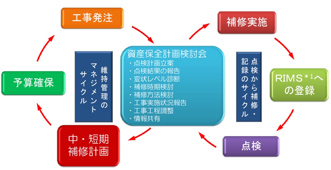 検討会頻度は、各事務所で月1回以上実施され、総括を年に1回支社で実施している。メンバーは、NEXCO東日本社員のみならずNEXCO東日本のエンジ系・メンテ系のグループ会社が参画している。時には、必要に応じて事務系社員・事務系グループ会社も出席し、NEXCO東日本グループ全体で協働し、安全安心快適な高速道路空間をお客様に提供するため高速道路資産の保全に努めている。図-19に示すように点検から補修・記録までのサイクルと補修計画から工事発注までのマネジメントサイクルの中心に、資産保全計画検討会が位置している。これにより、変状・損傷の補修を取りこぼすことなく、計画的・効率的に高速道路資産の維持管理を行っている。