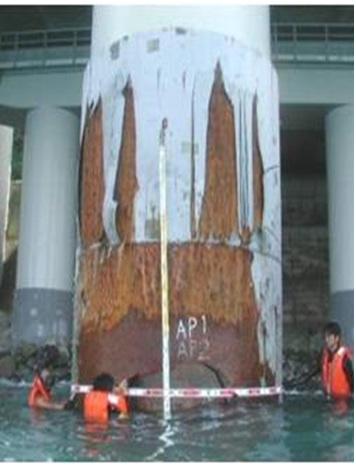 海中部のフーチングの摩耗事例、対策事例を写真-4、5に示す。これら摩耗に対しては、損傷した鉄筋の補修並びにフーチング上面、側面の増厚による対策を基本に、表面に鋼板や防舷材(ゴム)を設置して防護するなどの対策を行っている。