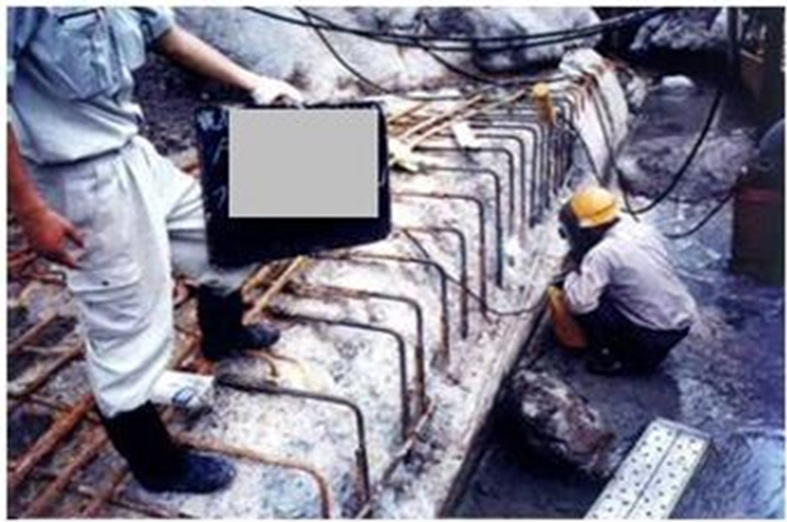 海中部に位置する橋脚躯体の耐摩耗層の損傷事例を写真-2に示す。鋼板に圧着されたクロロプレンゴムおよび鋼板が損傷し、橋脚躯体コンクリートが摩耗した事例である。これらの損傷に対しては、高強度コンクリートによる巻立て、PICフォーム(ポリマー含浸プレキャストコンクリート埋設型枠)(写真-3)、ダクタルフォーム(超高強度繊維補強コンクリート埋設型枠)を用いた巻立て工法にて補修を行っている。