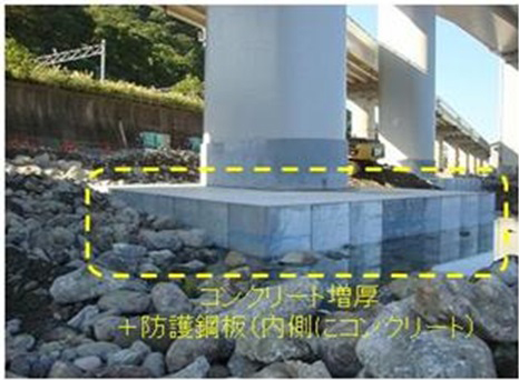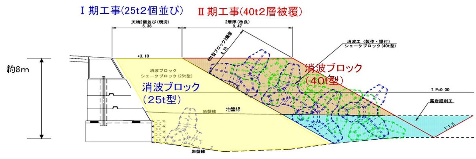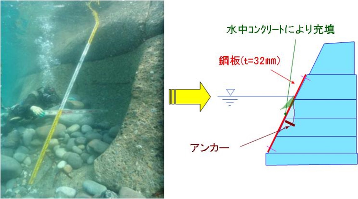 浸食に対する抜本的対策として、擁壁護岸+25t消波ブロックによる対策(H15~19年、写真-1)を実施したが、その後、 消波ブロックの流出や擁壁護岸工の一部で摩耗等の損傷が確認された。このため、摩耗箇所の水中コンクリート充填による補修、鋼板による補強、消波ブロックの流出対策として40t 消波ブロックによる被覆(平成22 年~ 図-5、図-6)を行っている3)。