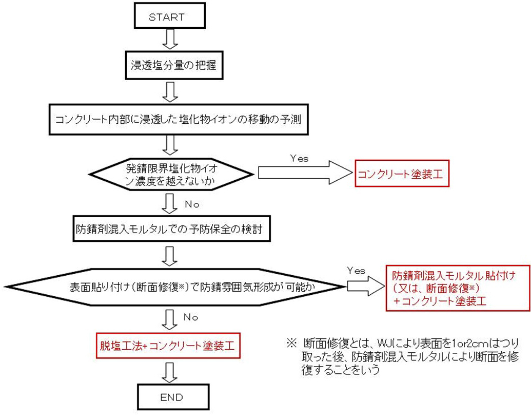 また、上部工の一部でも、建設時に予測した値以上の浸透塩分量が確認され、将来、鉄筋位置での塩化物イオン濃度が発錆限界塩分物イオン濃度(以下「発錆限界」)を超えることが予測されたため対策を実施している。対策工法の選定は、図-4に示す選定フロー4)により行っている。塗装仕様は、実橋試験施工、暴露試験で得られたデータを参考に表-3の塗装仕様Ⅱを採用している。各対策工法は、浸透塩分量の調査結果を基に、対策後の再拡散シミュレーションを行い、建設後100 年経過時点で、鉄筋位置で発錆限界を超えない、または防錆剤が既設コンクリートへ浸透し、対策後3 年以内に鉄筋位置で防錆雰囲気(亜硝酸イオンと塩化物イオンのモル比が0.8 以上)が形成2)されることを確認のうえ選定している。