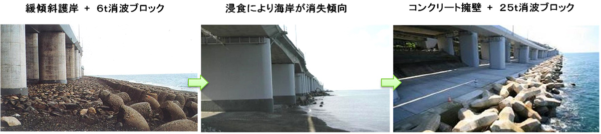 親不知海岸高架橋では、建設時には、緩傾斜護岸工による浸食対策や海中橋脚では消波ブロックによる波浪対策、砂礫の混じった波浪による摩耗対策として、橋脚躯体は、鋼板+クロロプレンゴム、フーチングは、増厚+鋼板などによる対策を行っている。しかし、予想以上の厳しい波浪の影響により消波ブロックの消失、耐摩耗層の損傷のほか、海岸浸食により供用15年後には緩傾斜護岸が消失(写真-1)したため、順次対策を行ってきている。