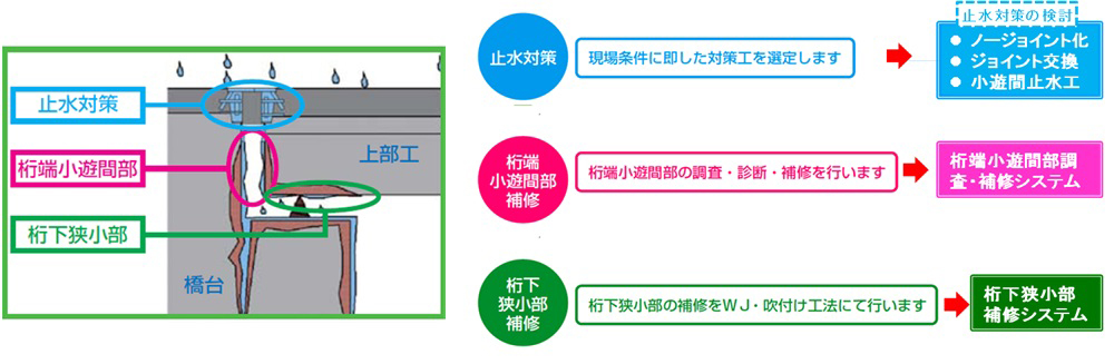伸縮装置からの凍結防止剤の混入した漏水により桁端部の塩害が顕在化しており、これらの補修は、図-7に示すように止水対策、桁下、桁端遊間部の補修を可能な限りセットで行うようにしている。遊間が狭い場合や桁下空間が狭小な場合の補修は、困難を極め、これまでは補修できないケースも見受けられた。