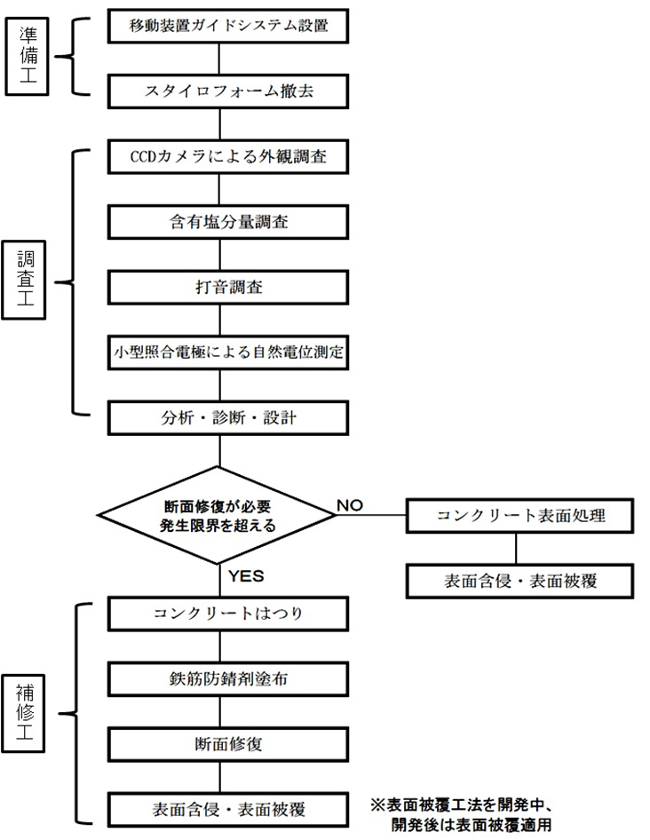図-8に桁端小遊間部の調査・補修の流れ、写真-11、12に調査状況を示す。各種調査を行い補修範囲やはつり深さを決定した後、WJ工法により劣化部をはつり(写真-13)、鉄筋防錆剤(塩分吸着剤入りポリマーセメント系鉄筋防錆剤)を鉄筋およびコンクリート表面に吹付け、遊間部に型枠設置後、断面修復材を注入し、表面被覆(含侵材塗布)を行って補修が完了となる。本システムは、実橋試験施工において他橋への展開が可能であることを確認しており、今後、継続的な改良を行いながら、本格的展開を図っていく予定である。>
