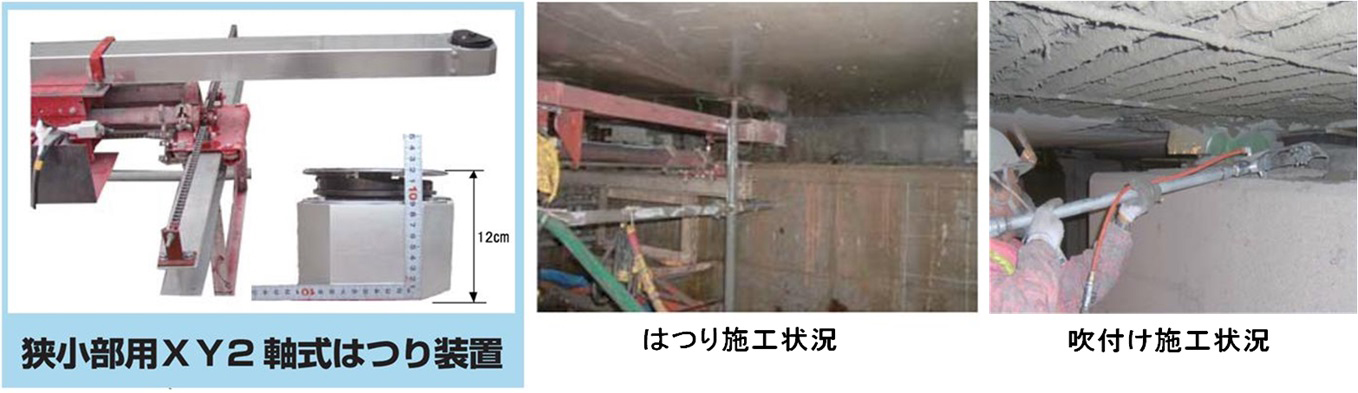 桁下狭小部の補修は、「桁下狭小部補修システム」(写真-14)により補修を行っている。本システムは、最小12㌢まで対応可能な狭小部用XY2軸式のWJはつり装置により劣化部のコンクリートを除去し、ノズル角度が可変調整可能な狭小部用湿式吹付けノズルを用いてPCMを吹付けて断面修復を行う補修システムで、既に多くの補修実績がある。