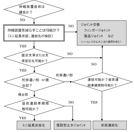 ゴムジョイント等の簡易な伸縮装置は取替えが必ず必要となる。この取り換え時に止水効果の高い構造を採用することも含めて検討することにしている。まず、伸縮装置をなくすことを考える。橋台部はミニ延長床版や埋設型止水工法、掛け違い部は床板連結を検討する。また、簡易鋼製ジョイントは現在所定の性能が確認されたものを使用することになっているが、前述のとおり独自にさらに止水性の高い工法を開発している。検討の流れを図-5に示す。
