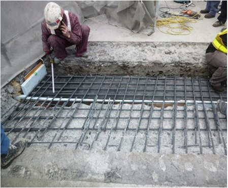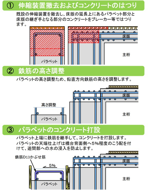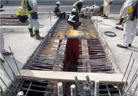 ミニ延長床版とは橋台パラペットの上端をはつり、その上に橋梁の床版を伸ばしたものである。支承が固定支承の場合に適用し、支承が可動支承の場合は固定化が可能な場合に適用する。遊間の伸縮は桁の回転のみであり、舗装は通常の舗装とする。施工手順を図―6に、配筋状況を写真―4に示す。