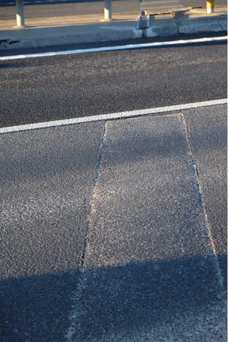 この構造はミニ延長床版と同様に固定支承部に用いる。橋梁伸縮部舗装下面のコンクリート部分内に三角形の空間を作りその中にシームレスW止水工法で止水するものである。施工時間は一般の簡易鋼製ジョイントとそれほど変わらず、止水構造はシームレスW止水であり止水性は高い。また、舗装面は一般の舗装であり、舗装改良と同時に施工すれば埋設ジョイントのような、段差もなく、伸縮装置による騒音・振動が発生しない。追い越し車線のみを舗装と同時施工し、走行車線は橋梁伸縮部のみ舗装を打ち替えた状況を写真―5に示す。
