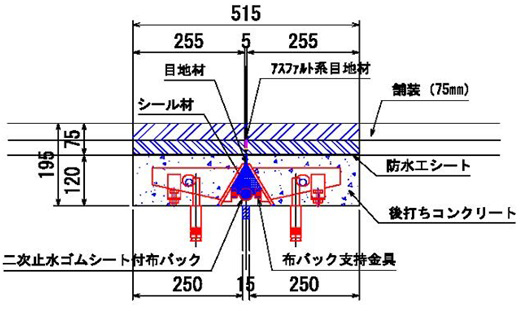 ミニ延長床版は施工時間が長いため、大都市部では施工が困難である。これを解決するため、簡易鋼製ジョイントと同様な施工時間でミニ延長床版と同じ効果を発揮するように開発されたのが「埋設型止水ジョイント」である。名前から埋設ジョイントと誤解されるが、全く異なるものである。埋設ジョイントは舗装の部分に特殊な伸縮ができて止水性のある材用を用いるものであるが、「埋設型止水ジョイント」の舗装自体は一般の舗装材料であり、舗装下に止水構造を構築するものである。図―7に構造図を示す。