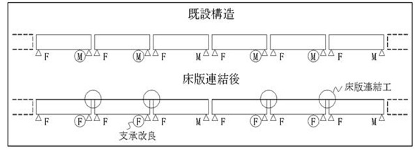 単純桁橋が連続する場合や連続桁橋の間に単純桁橋がある場合など、単純桁橋の可動支承を固定化してその支承部の伸縮装置を取除き、床版を連結して伸縮装置をなくす工法である。変更の概念図は図―8に示すとおりである。
