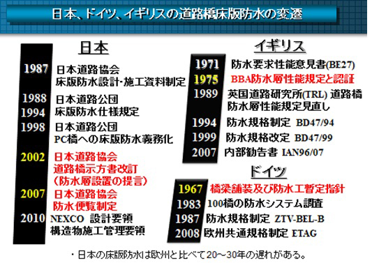 欧州では、1970年~1980年代にRC床版やPC床版において版の上部での塩害が顕在化して問題となったことから、1990年にはドイツ連邦道路局から補修・補強事例集が出版され、注意を喚起するに至っている。防水層そのものの適用はそれよりかなり古くから行われてきていたが、これを機にさらに防水層の性能評価基準や施工管理方法も重要視され、ひび割れ開閉試験等による耐久性の評価が行われるようにもなってきている。現在は瀝青系シート防水と樹脂系塗膜防水が中心に使用されており、その比率は全体で 8:2、ベルリン市内に限ってはこの比率が逆転しているとのことであった。