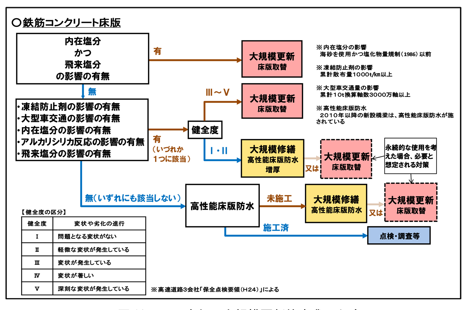 「内在塩分+飛来塩分」の影響がある場合は、健全度がと著しく低下しており、早い段階で、耐久性の高いプレストレストコンクリート床版に取替えが必要である。また、何れかの劣化要因があるものは、健全度が今後急激に低下することが想定され、いずれ床版取替えが必要と考えられる。健全度が比較的良好(Ⅰ・Ⅱ)な床版は予防保全(高性能床版防水)並びに床版増厚等により性能の向上を図るが、既に変状が顕在化している場合(Ⅲ~Ⅴ)は、予防保全の効果が十分期待できないと考えられることから、劣化が進行した時点で更新することとした。以上の考え方を基に整理したRC床版における大規模更新等事業の判定フローを図10に示す。