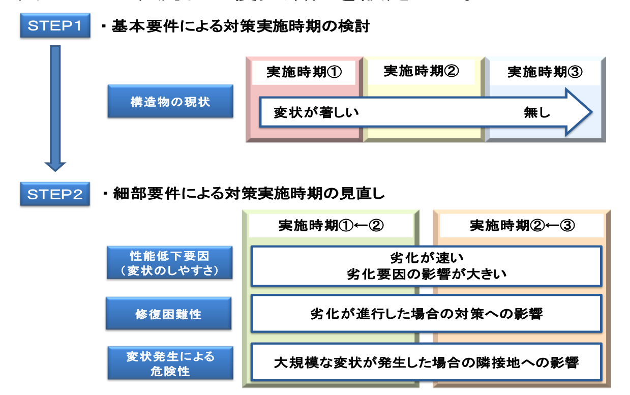 大規模更新・大規模修繕の実施に当たっては、実施対象となる本体構造物の現在の状態や変状の進行度などにより適切で効果的な対策時期を検討する必要がある。実施時期の検討に当たっては、変状の進行状況の分析及び点検サイクルを踏まえて対策実施時期の期間設定を15年とし、図11に示す流れで優先順位を設定した。