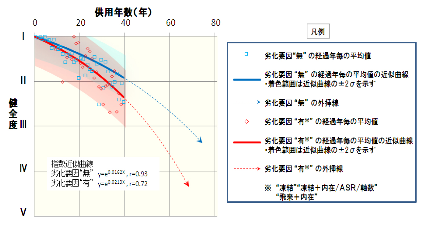 RC床版について、疲労、塩害、アルカリシリカ反応に関わる各要因及びその組合せ別に健全度を分析した(図8)。この結果、劣化要因が無い「劣無」場合と比較し、何れかの劣化要因がある場合、健全度が低下している。特に「内在塩分かつ飛来塩分」の影響がある場合は、現時点で95%以上床版で健全度がⅢ・Ⅳ・Ⅴと、著しく低下している事が把握できた。また、図9には供用年数別の健全度の推移と予測を示す。この図から、劣化要因 が有る場合には健全度が急激に低下する傾向がうかがえる。また、劣化要因が無い場合でも永続的な健全性の維持は難しいことも把握できた。