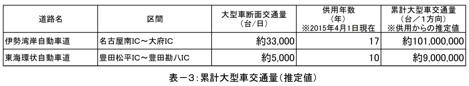 このため、名古屋支社において有識者の方々による委員会を設け、損傷原因と対策について検討を行っている。損傷状況としては、損傷したビームの破面を観察し、破壊の起点、破壊の方向、破壊性状を確認した結果、疲労亀裂と推定された。疲労損傷の原因となる大型車交通量を2014年の伊勢湾岸自動車道でみると、表-1のとおり日平均断面交通量が約7.3万台/日に対し大型車混入率が約37%で、大型車の日平均断面交通量が約2.7万台/日と非常に多い路線である。また供用からの累計大型車交通量(1方向)を試算すると、東海環状自動車道 豊田松平IC~豊田勘八IC間(供用年数 約10年)が約9百万台に対して、伊勢湾岸自動車道 名古屋南IC~大府IC間(供用年数 約17年)が約101百万台と約11倍となっている。(表-3)