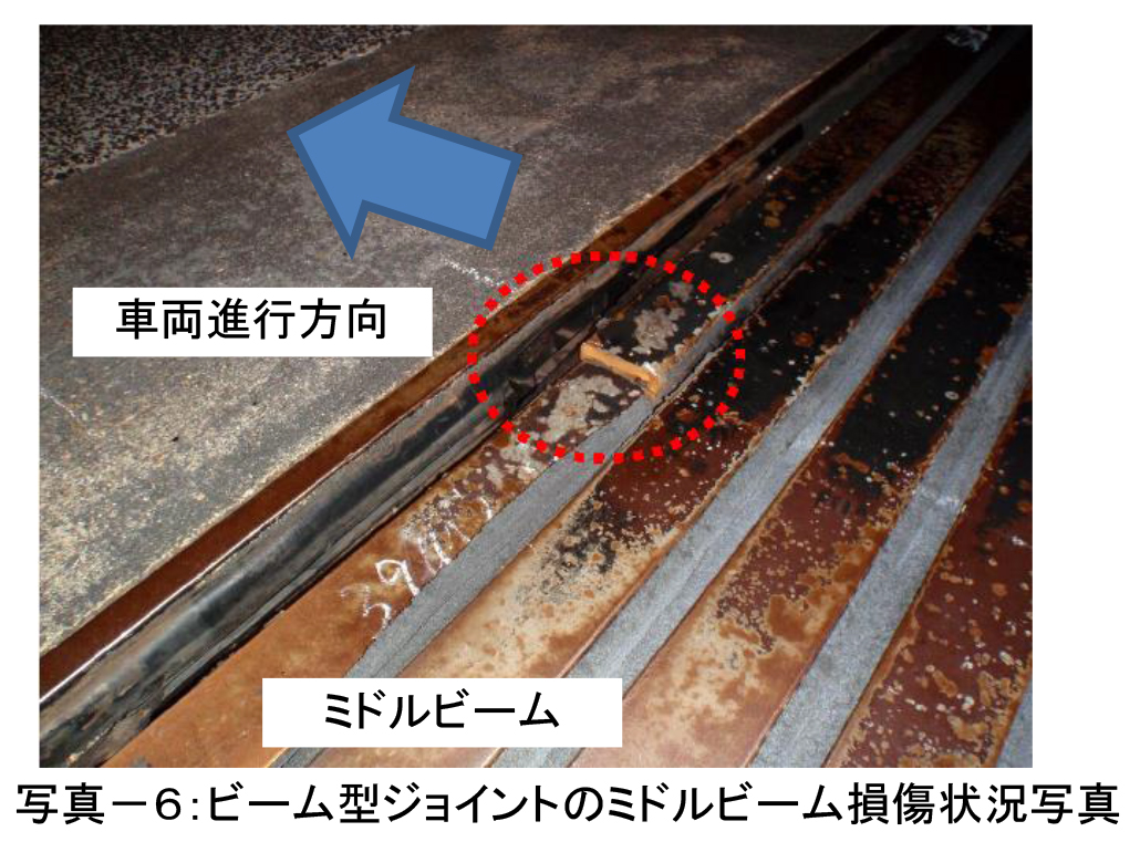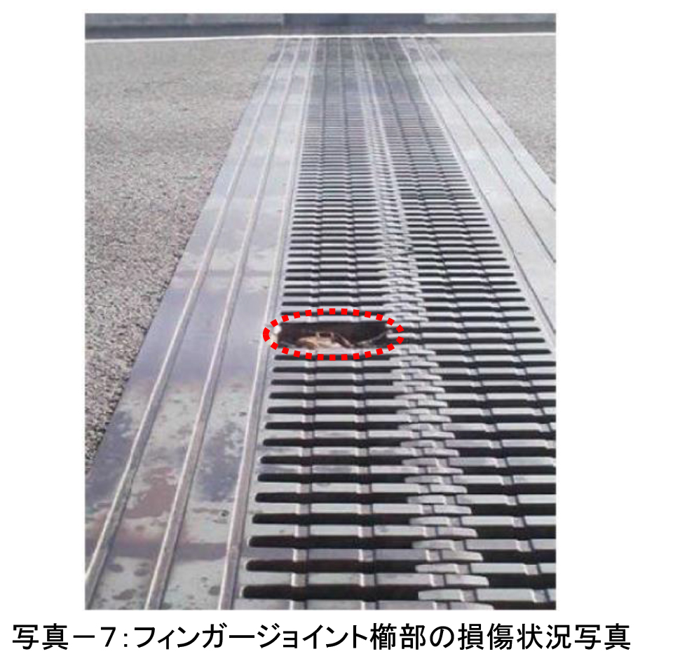 旧日本道路公団において、1996年~2004年間に建設された伸縮桁長が長く伸縮量が大きい橋梁の伸縮装置には、鋼製ジョイントの1つであるビーム型ジョイントが数多く採用されてきた。当時は、東名高速道路において発生した鋼製フィンガージョイントの破損事故により、新たな鋼製フィンガージョイントの使用を一時見合わせ、有識者による委員会において原因と対策の検討をしていたこともあり、この時期に万博前の全通に向けて工事を進めていた名古屋支社管内の伊勢湾岸自動車道及び東海環状自動車道では、連続径間数の多い高架橋の設計・施工において、大伸縮量に適用可能であったビーム型ジョイントを多数採用していた。この内、伊勢湾岸自動車道で採用したビーム型ジョイントにおいて供用後10年程度経過した段階でビームの損傷が多数見られるようになった他、一部の高架橋で用いられた鋼製フィンガージョイントにおいてもフィンガーの櫛部の折損が発生した。(写真-6、写真-7)