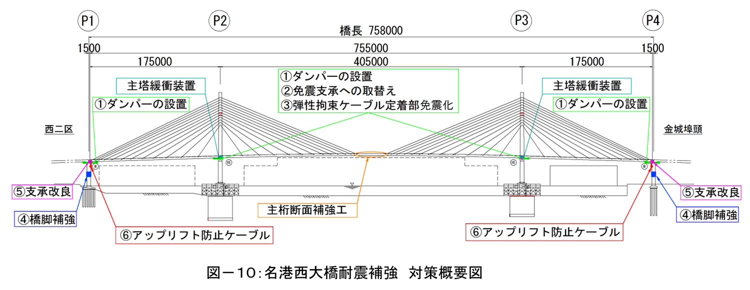 伊勢湾岸自動車道 名港西大橋(上り線)は橋長758㍍の3径間連続鋼斜張橋である。名港トリトン3橋のうち、名港西大橋Ⅰ期線として昭和60年に開通させており、他橋に比べ設計時点が古く構造細部の作りも異なるため、先行して耐震検討を行った。この橋梁で耐震性能を照査した結果、レベル2地震時に主桁支間中央部付近で下フランジの一部が塑性化。また、全体系の変形が大きく主塔の柱基部が塑性化するとともに、端橋脚はペンデル支承に引っ張られてせん断耐力の超過や鉄筋段落とし部の降伏並びに許容変位を超過、さらに桁端部では桁遊間量を大幅に超過することが判明した。このため耐震補強の内容としては、橋軸方向地震時の変位を抑制し、主桁端部と主塔柱の損傷を低減するため全橋脚に制震ダンパーを設置(①)、直角方向地震時の主塔柱及び下段梁部損傷対策のため中間支点は免震支承に取替え(②)、名港西大橋の構造的な特徴である弾性拘束ケーブルが抵抗することで長周期化を妨げ主塔の橋軸方向変位を大きくすることから、変位を抑制するため弾性拘束ケーブル定着部を免震支承を設置(③)、橋軸方向地震時に端橋脚柱に大きな曲げ及びせん断力の作用による損傷対策のため端橋脚の補強(④)、橋軸直角方向の水平荷重に対し水平支承の終局耐力を超過するため支承改良(⑤)、ペンデル支承が損傷した時の桁の浮き上がりを防止するためアップリフト防止ケーブル設置(⑥)を行う計画とした。