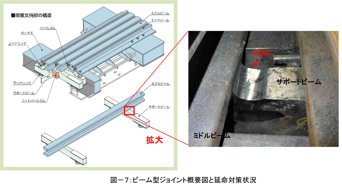 抜本対策としては、ジョイントの取替えを考えているが、大遊間で大型のジョイントであること、使用箇所が多いこと、交通量が多く規制が容易でないことから、全ての取替えを完了するには期間を要することから、延命対策として、解析や疲労実験から疲労強度増加の効果が確認されたミドルビームとサポートビーム交差箇所の溶接部について溶接補修+R加工等を行うこととしたが、この部分がすみ肉溶接の場合は延命効果が期待できないので、早期の取り替えが必要である。(図-7)