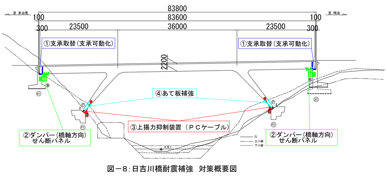 中央自動車道 日吉川橋は1973年に供用した橋長84㍍の鋼3径間連続方杖ラーメン橋である。この橋梁の耐震性能を照査したところ、レベル2地震時に橋軸・直角方向ともに脚柱と補剛桁が降伏することが判明した。このため、橋梁全体を免震構造とすることにより地震力を低減することとし、具体の補強内容としては、①支承改良(端支点部の直角方向を可動化)、②ダンパーの設置(橋梁全体の橋軸方向の動きを抑制し、脚柱及び補剛桁の応答を軽減するため桁端部にせん断パネル設置)、③方杖橋脚部へのPCケーブルの設置(上揚力抑制装置)と④あて板補強(脚柱及び補剛桁の降伏対策)を行った。