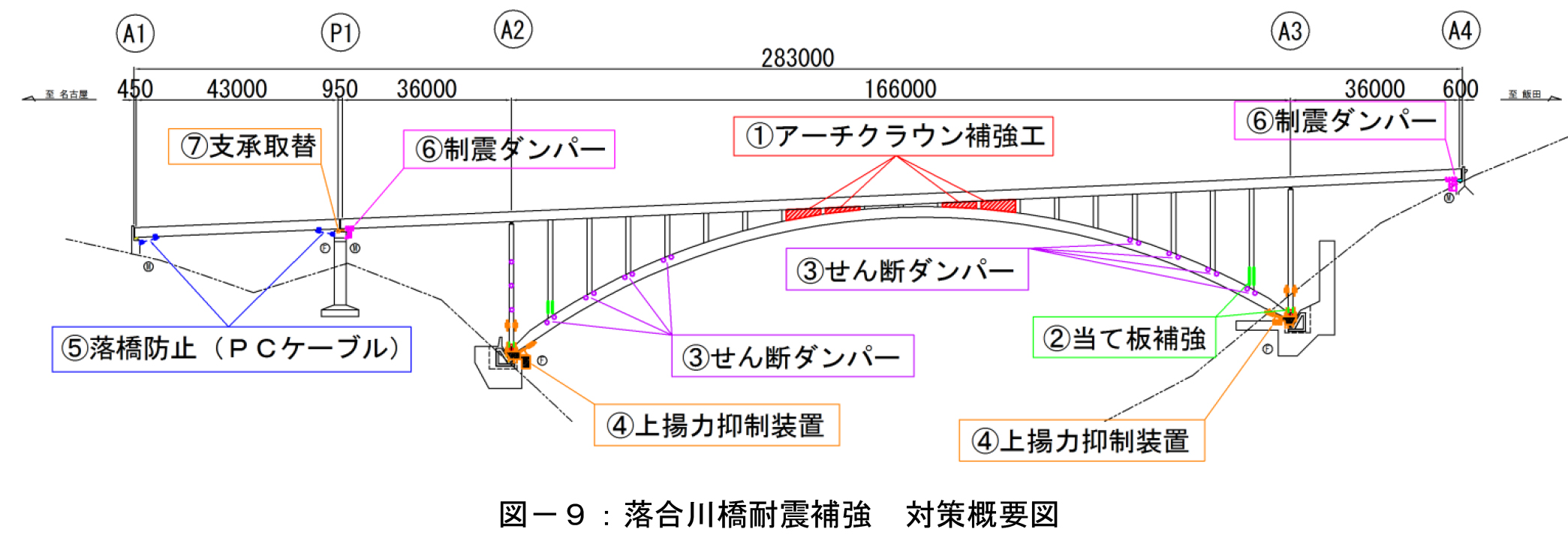 中央自動車道 落合川橋は急峻な谷地形を活用して架けられたアーチ支間166㍍の鋼逆ローゼ橋であり、1975年に供用した橋である。この橋梁で耐震性能を照査したところ、レベル2地震時に橋軸方向では補剛桁と支間中央付近の鉛直材が降伏し、直角方向ではアーチリブと鉛直材および横桁が降伏及びアーチ支承部に上揚力が発生することが判明した。このため、橋梁全体を制震構造とすることにより地震力を低減することとし、耐震補強の内容としては、アーチクラウン付近の降伏対策としてアーチクラウン部の剛性強化を図る補強工(①)、鉛直材の降伏対策のためのあて板補強(②)、端部鉛直材並びに近傍部材の橋軸直角方向の振動を抑制しアーチ下端での上揚力を軽減するためせん断ダンパーを設置(③)、アーチ支承部に発生する上揚力による鉛直材取付ボルトとアーチリブ取付ボルトの破断対策として上揚力抑制装置を設置(④)、補剛桁の降伏対策として端支点部に制震ダンパーを設置(⑥)、さらに支承取替え(⑦)を行うこととした。